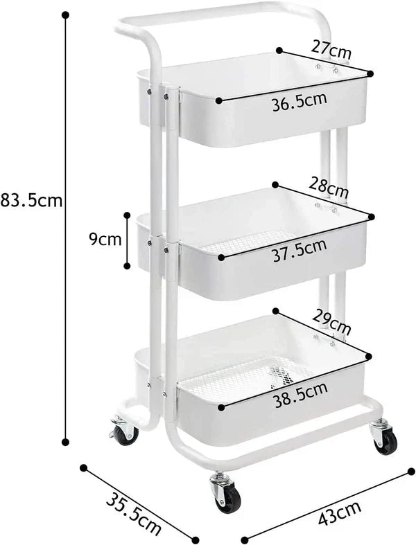 - Spacious storage capacity - This multi-purpose trolley has 3 large storage baskets with a size of 40 cm L x 30 cm W x 8.3 cm H and creates extra storage space to save floor space and keep your home well organised, ideal for storage in kitchen, bathroom and office supplies