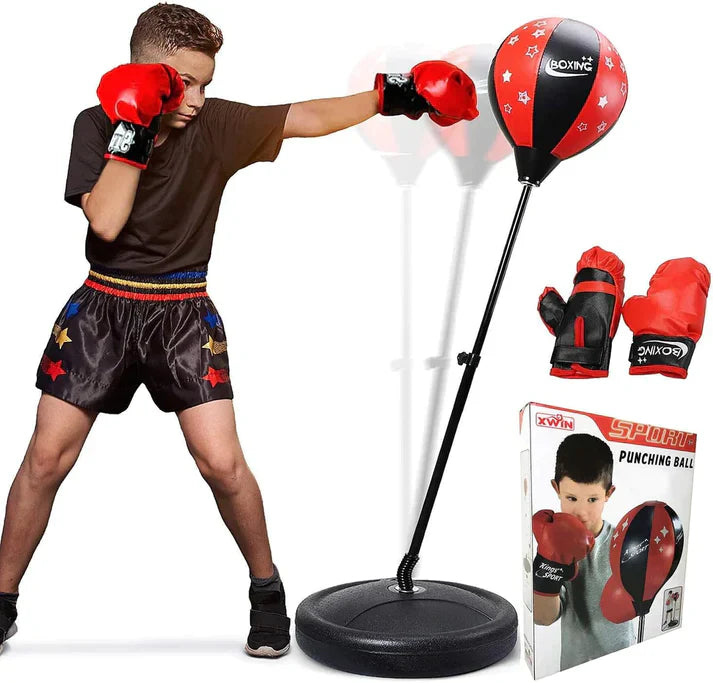π₯ THREE-PIECE BOXING SET: Perfect for kids who want to get into boxing or want more practice at home by themselves, it includes a pair of gloves, a tall punch ball, Pump, and height adjustable stand from 80 cm to 110 cm.