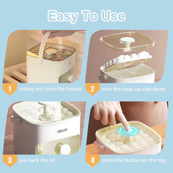- This ice tray adopts a push type, which can quickly release ice cubes. Simply invert the ice tray onto the ice box, cover it with the lid, and press the middle of the ice box with both hands to easily remove the mold. Don't fill the water too full.